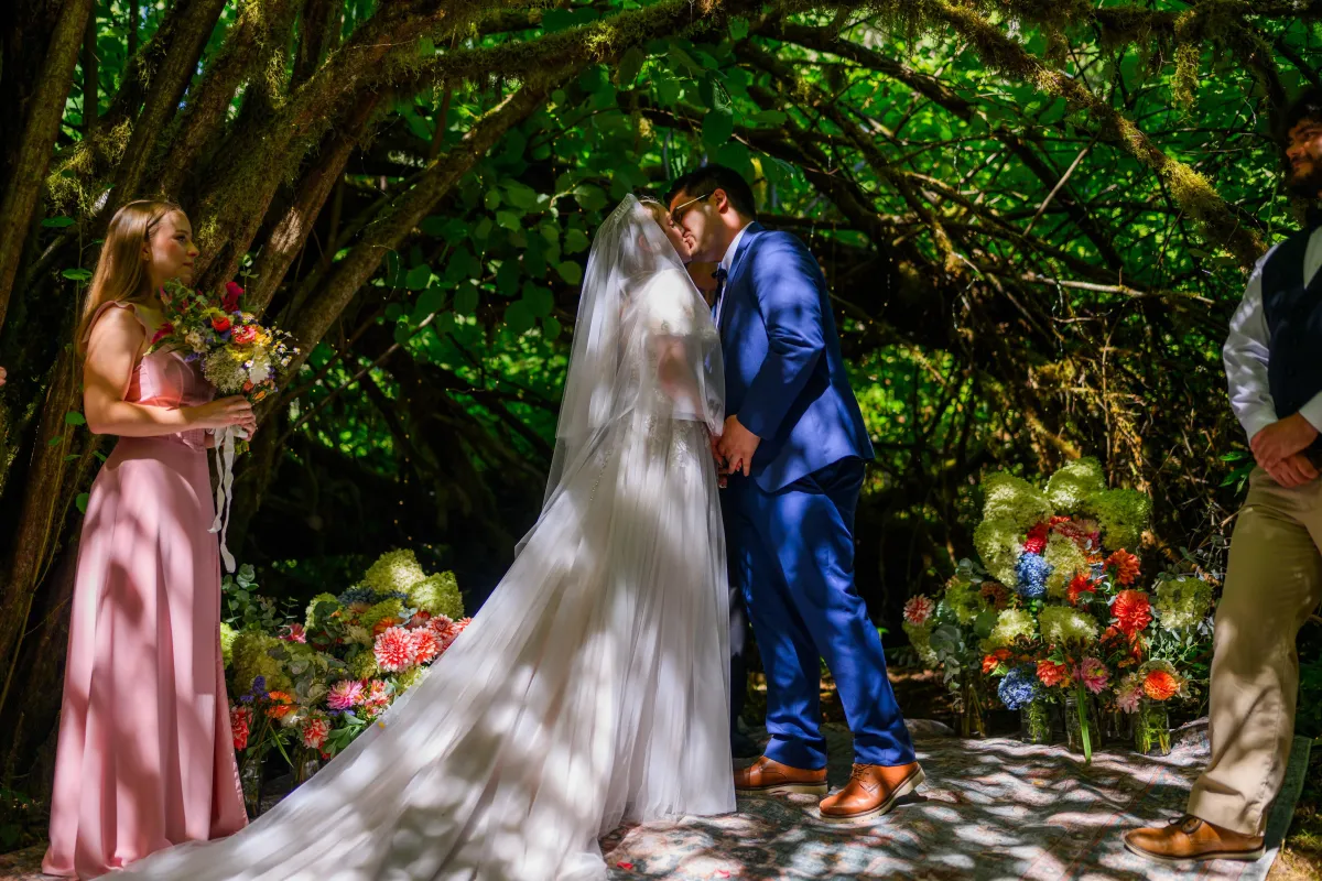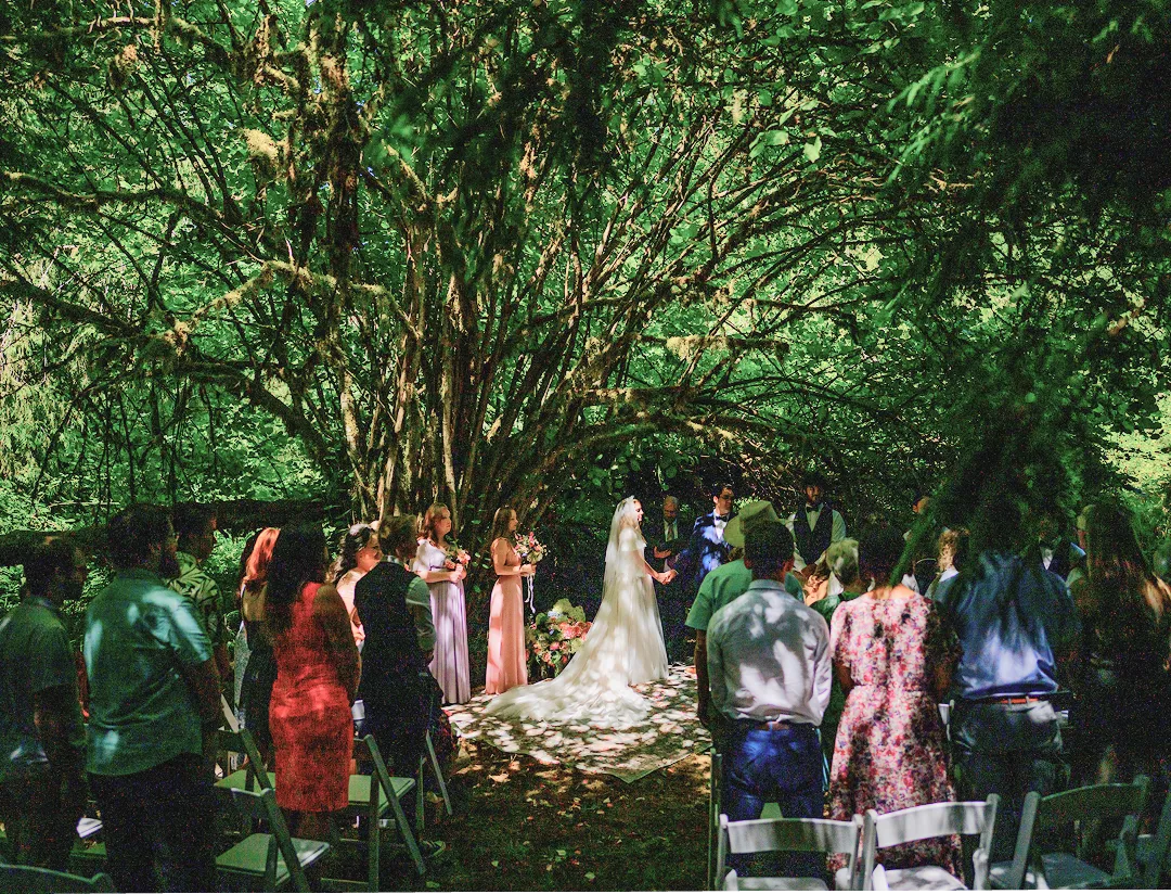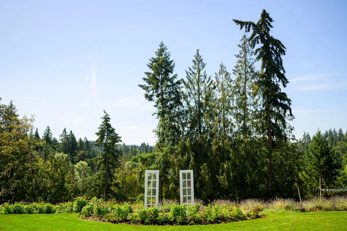 Set your ceremony against sweeping gardens and forest light. Whether it’s a sunlit clearing or a floral arch framed by trees, each setting feels timeless and deeply personal.