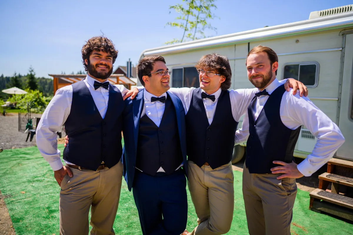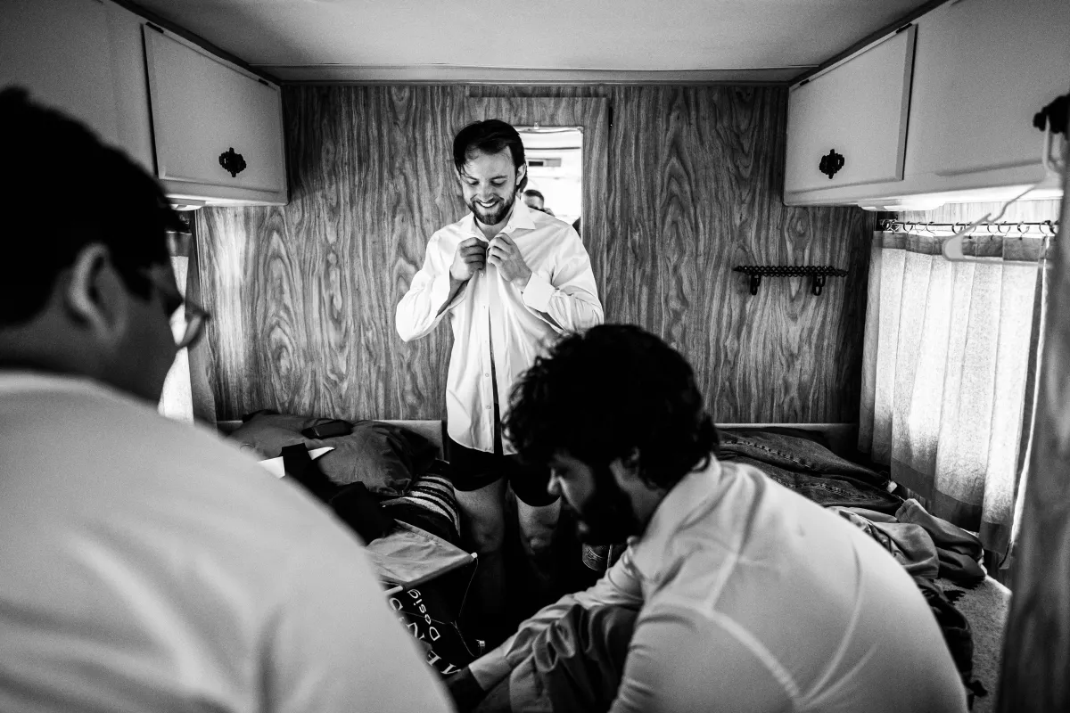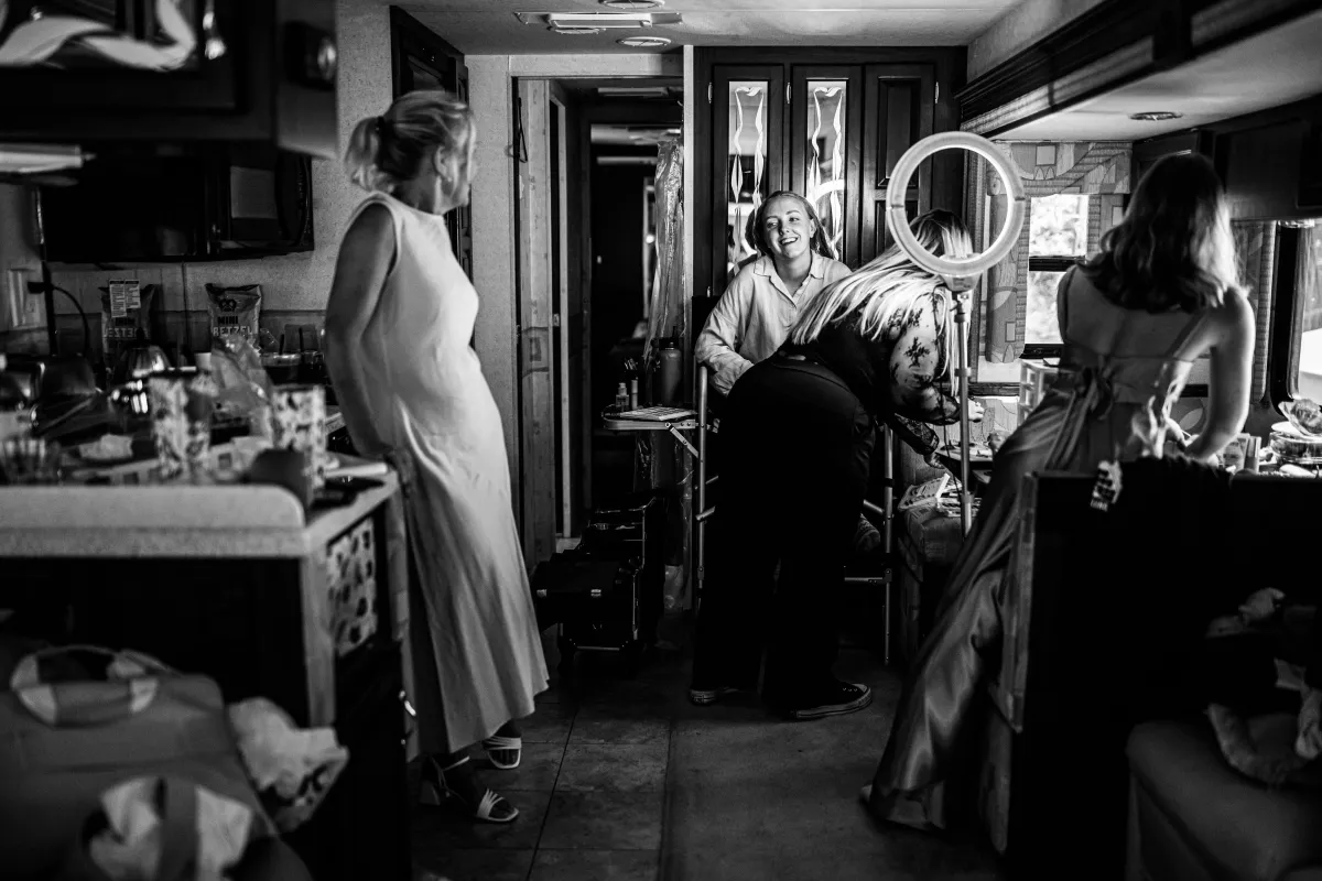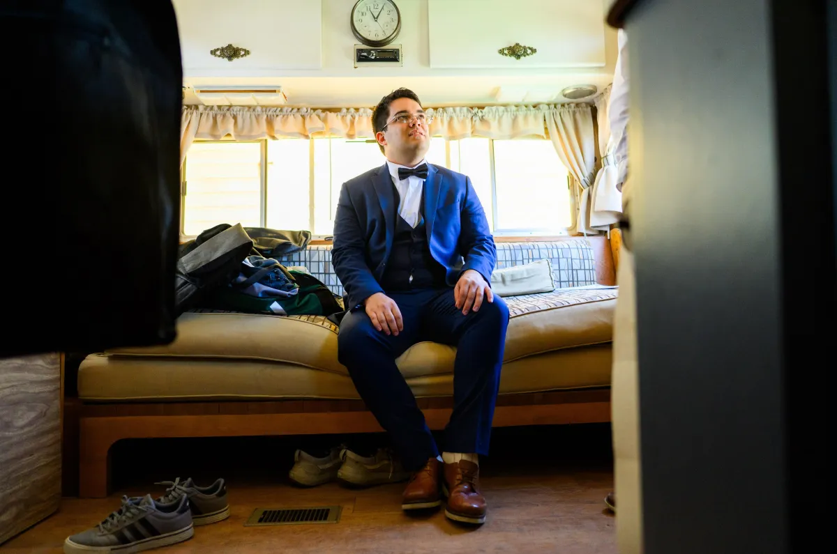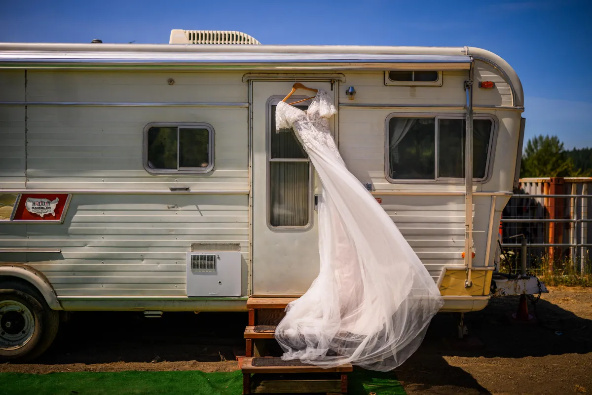 The bridal motorhome and groom’s vintage trailer create charming, tucked-away spaces to prepare for the day. They set the tone for calm, joyful moments and unforgettable photos.