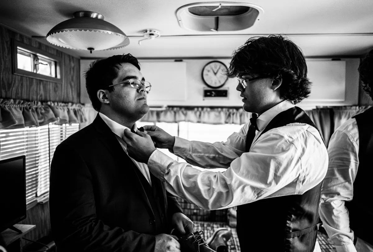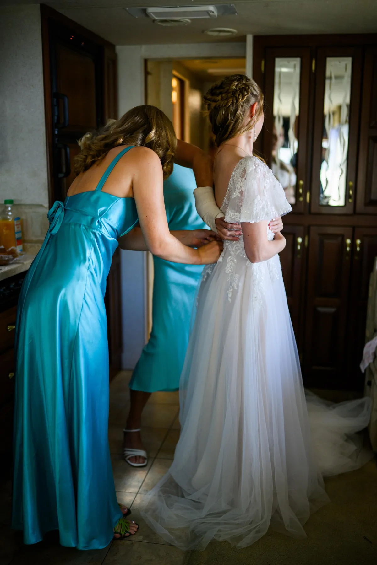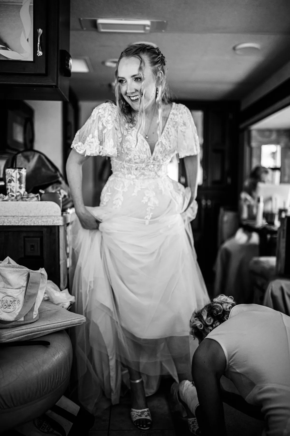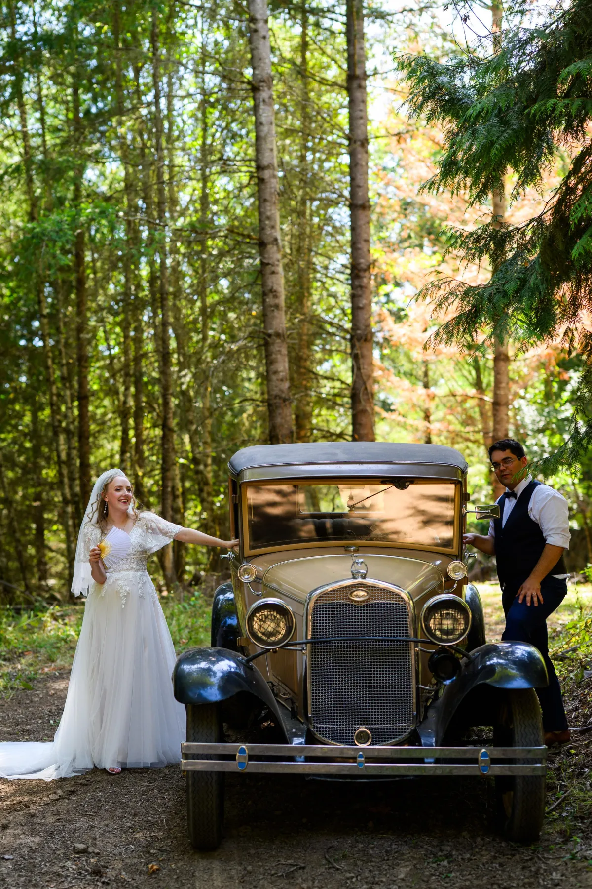 The bridal motorhome and groom’s vintage trailer create charming, tucked-away spaces to prepare for the day. They set the tone for calm, joyful moments and unforgettable photos.