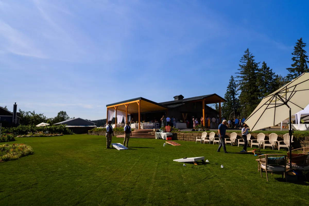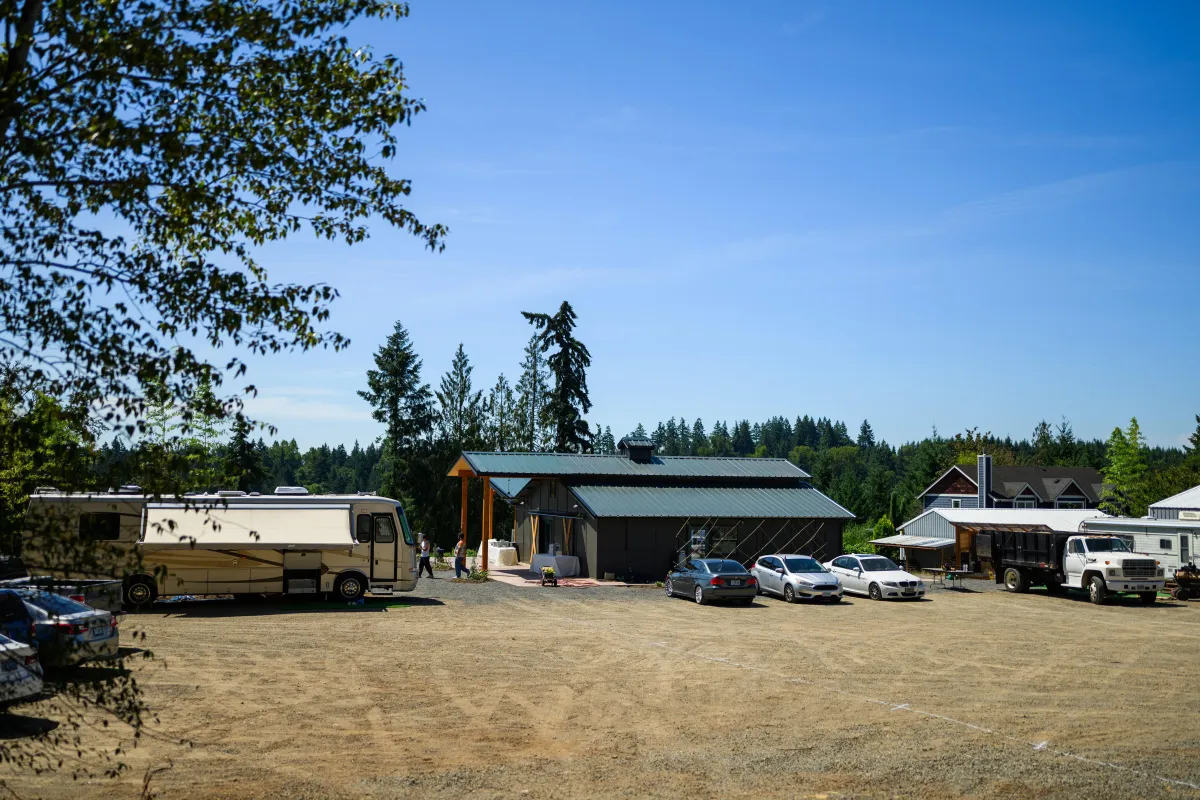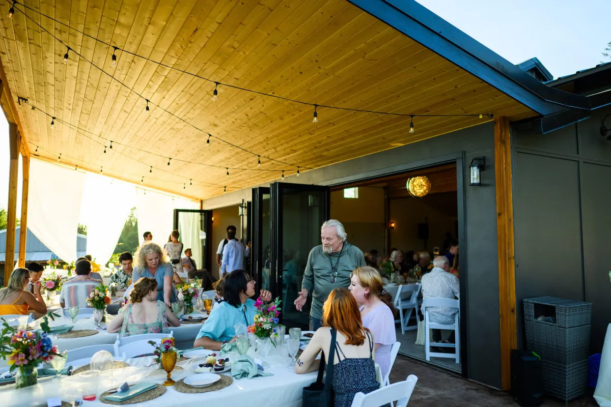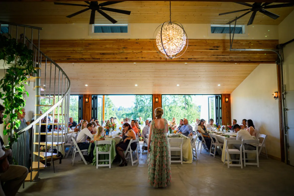 The barn’s 30-ft doors open wide to reveal the Oregon landscape. Guests feel the breeze, see the gardens, and watch the sunset without ever leaving the dance floor.