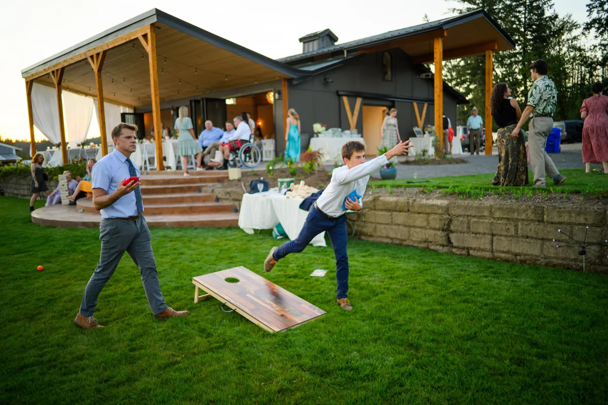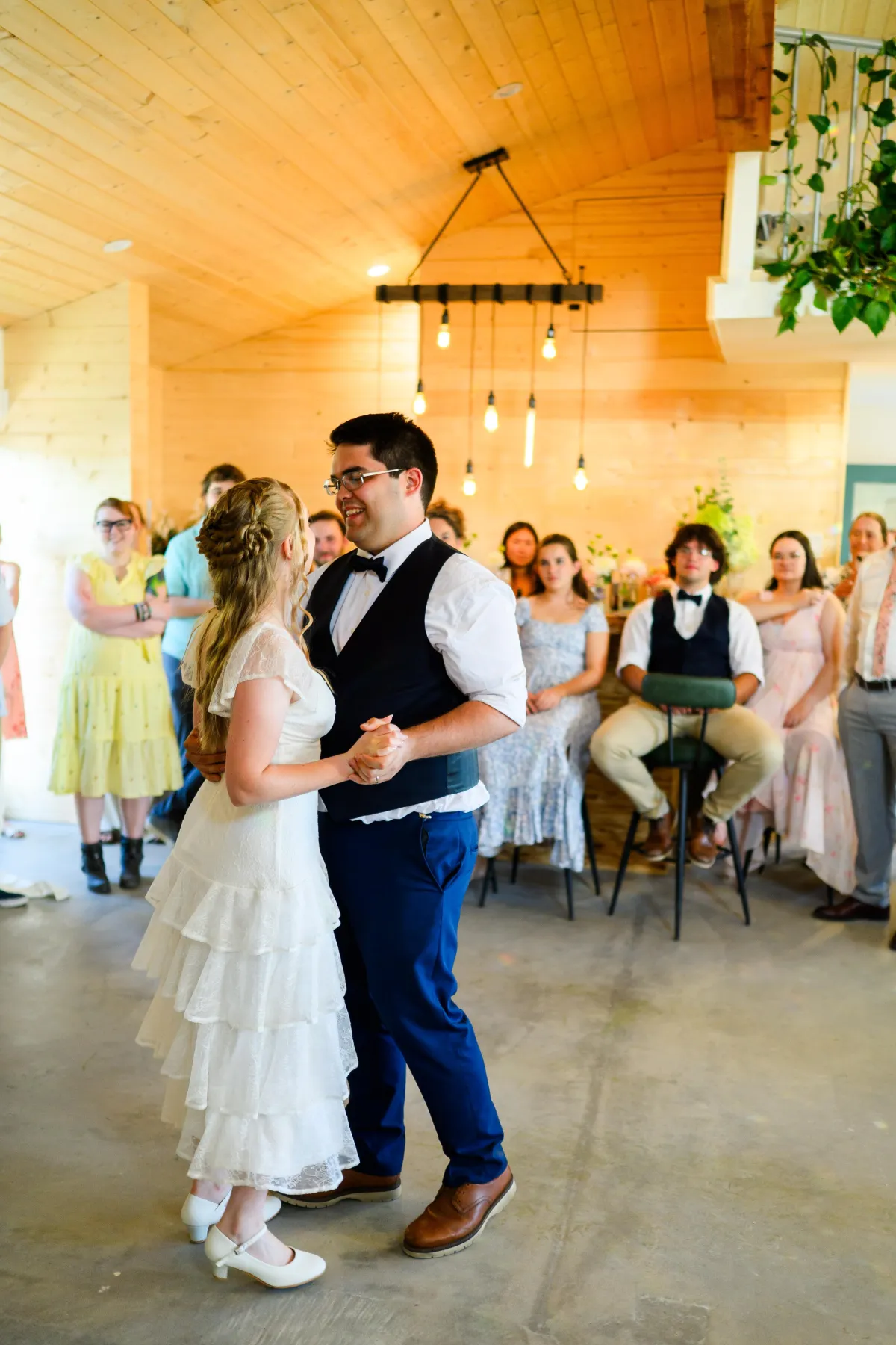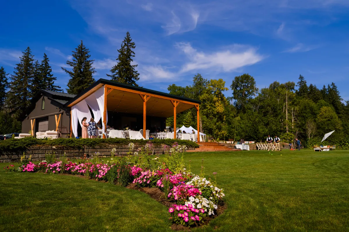 The barn’s 30-ft doors open wide to reveal the Oregon landscape. Guests feel the breeze, see the gardens, and watch the sunset without ever leaving the dance floor.